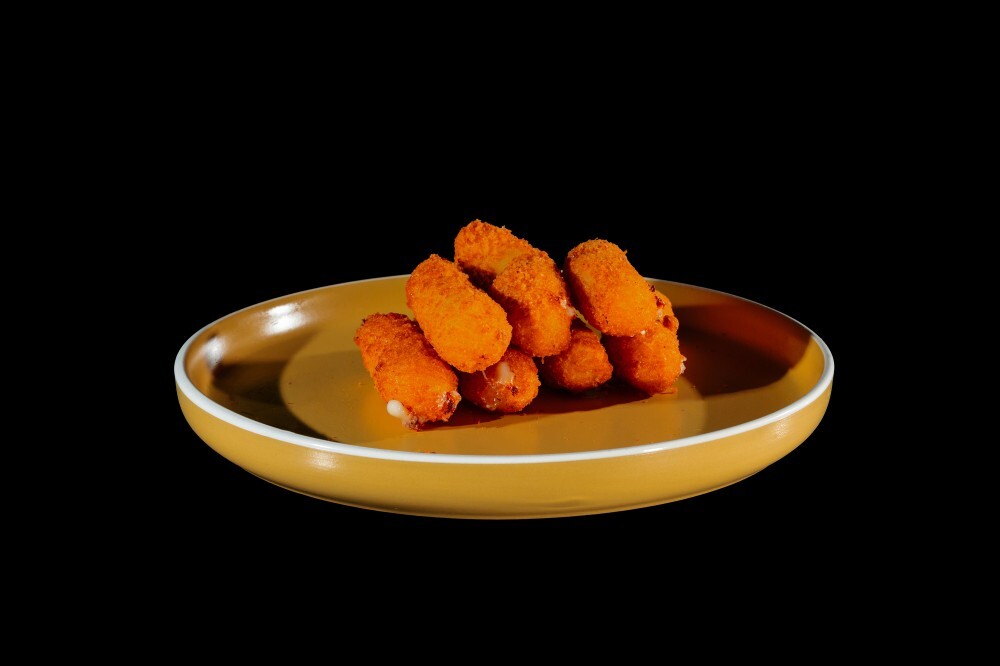 Тянущийся сыр моцарелла в золотистой хрустящей панировке.