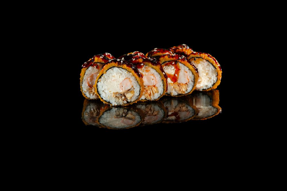 Рис, нори, творожный сыр, креветка, угорь, огурец, сухари панко , Соус унаги