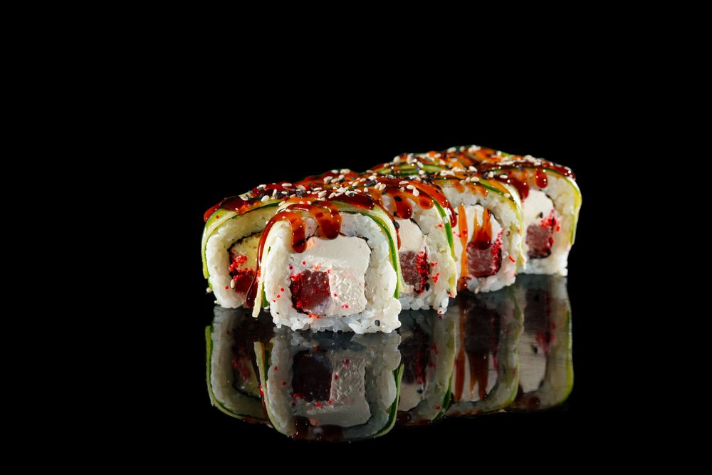 Нори, рис, сыр творожный, тунец, огурец, масаго