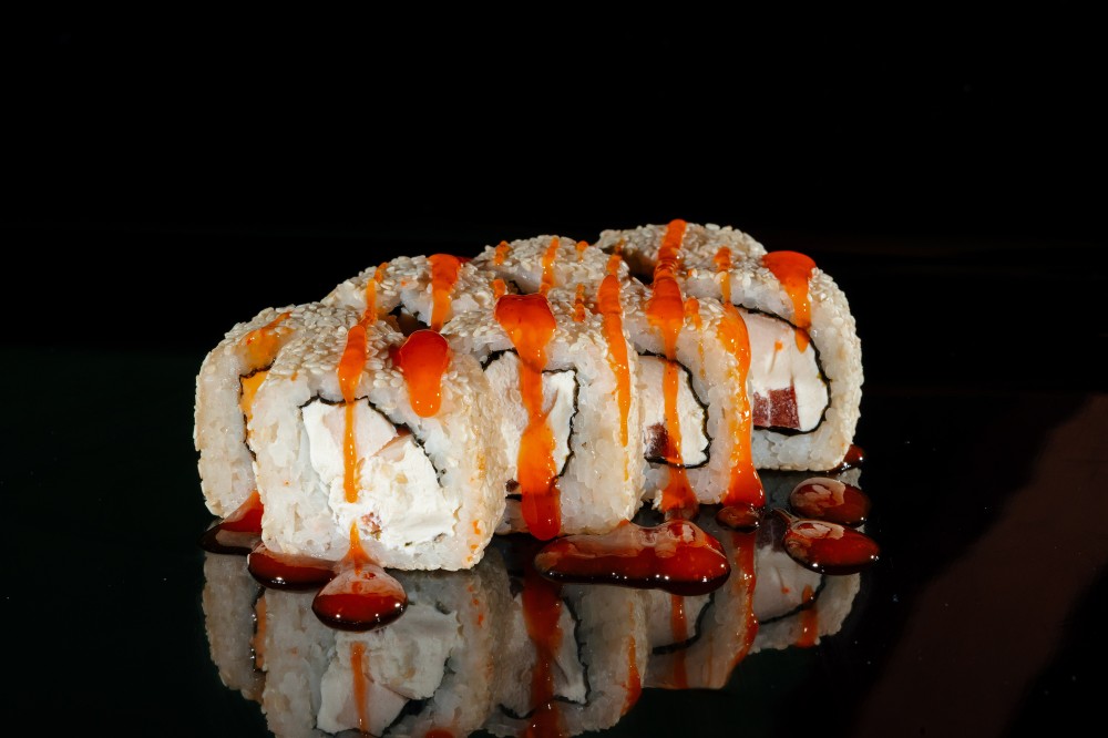 Рис, нори, сыр творожный, курица, помидор, белый кунжут, соус свит чили