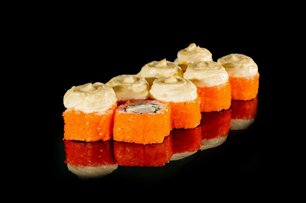 Рис, нори, сыр творожный, креветка, огурец, масаго оранж, белый соус